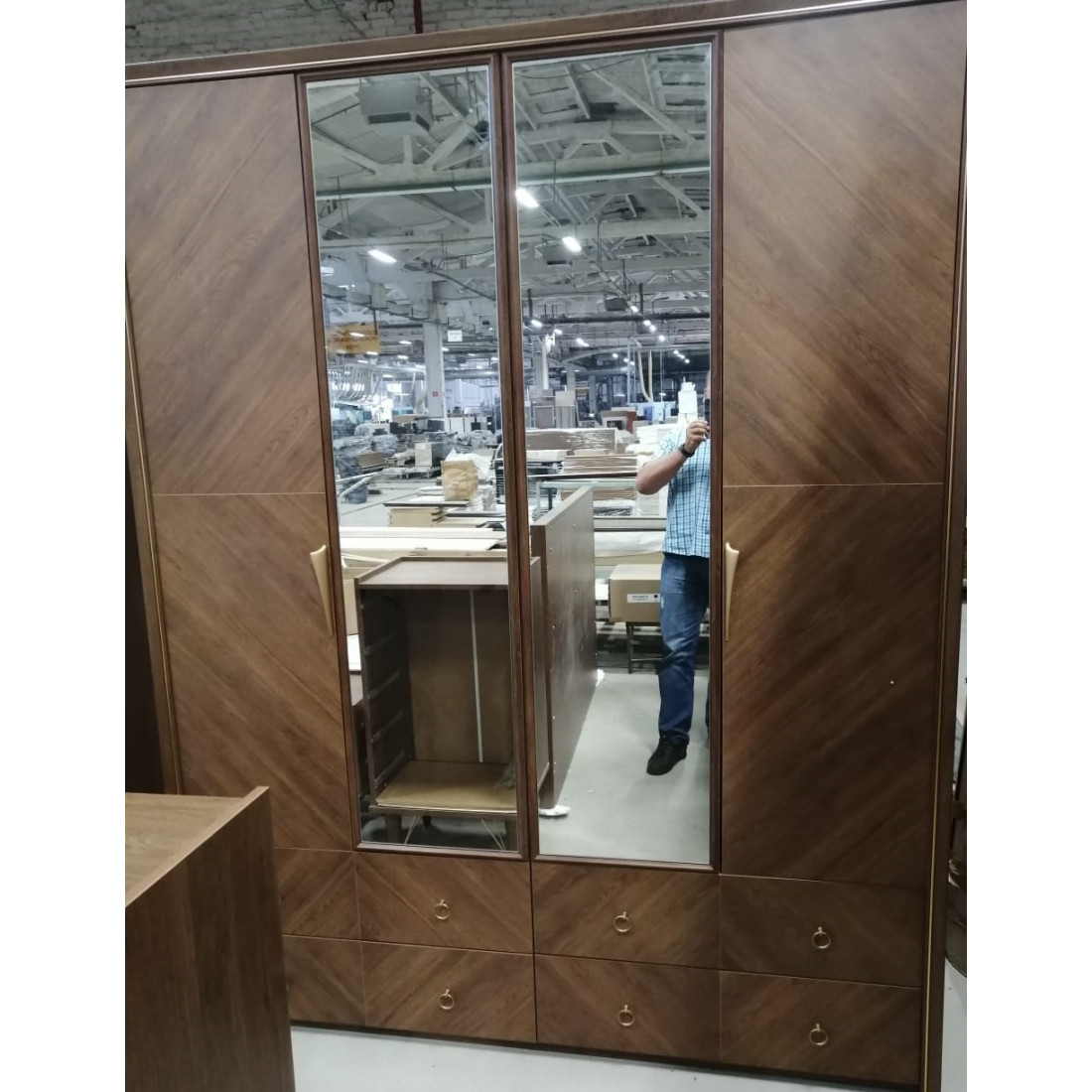 Четырехстворчатый распашной шкаф для одежды с зеркалами Пальма PALMA-20 размером 1874х2354х578мм  от Беллона выполнен в необычном дизайнерском решении. Оригинальный рисункок пленки на фасаде дверей и ящиков, имитирующие шпон натурального дерева. Комбинированная модель шкафа с 4 дверьми и 4-мя ящиками , дополненная зеркалами, классический темный цвет орех и сочетание современного, заметьте неизбитого дизайна- это то что нужно Вашему интерьеру!