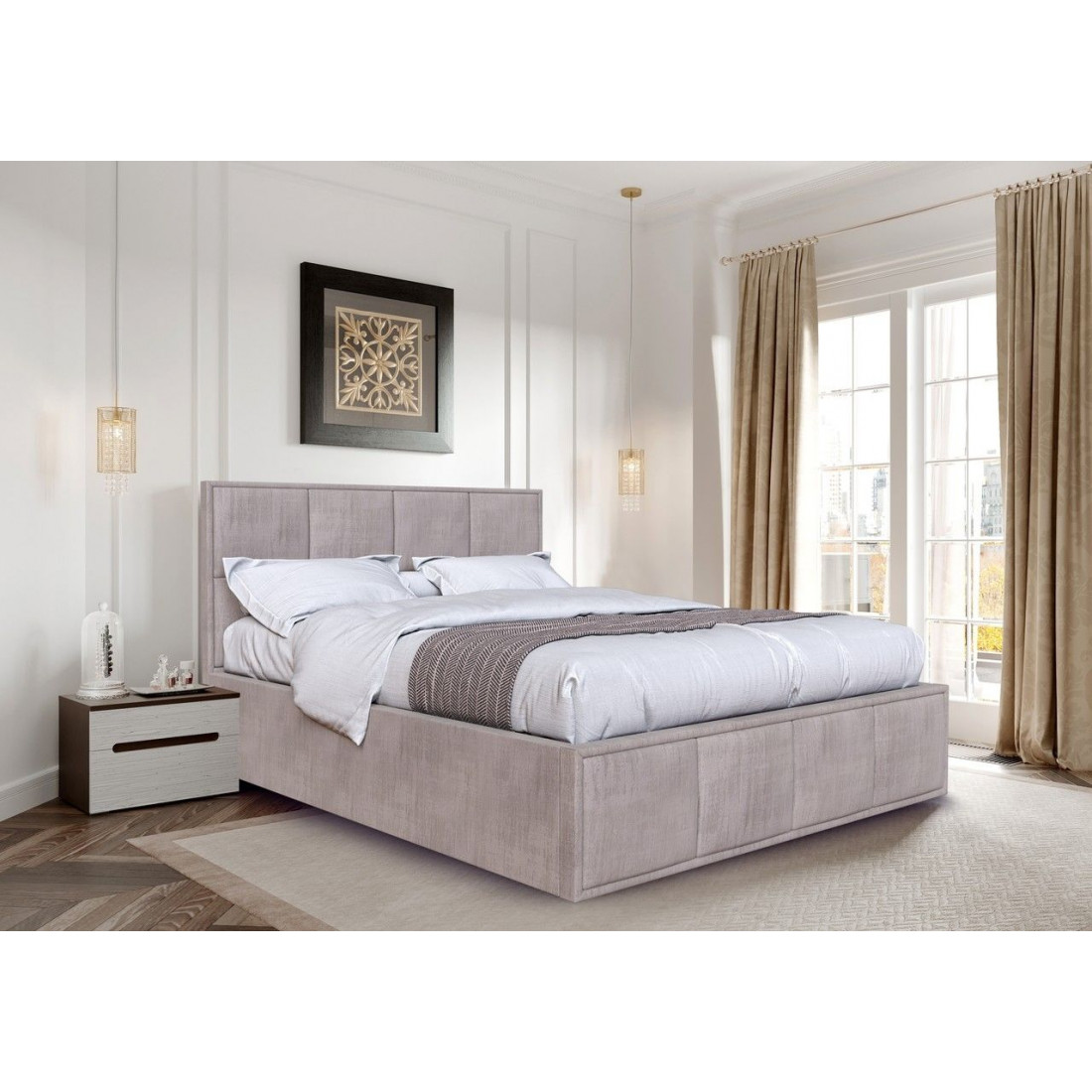 Кровать можно комплектовать ортопедическим основанием на пяти опорах или бельевым ящиком с подъемным ортопедическим основанием.