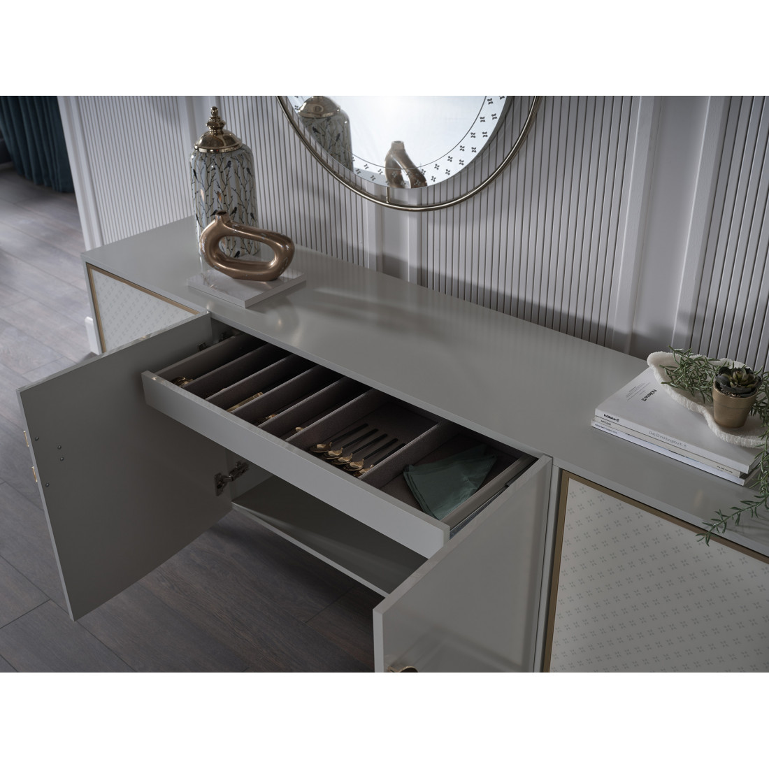 На стеклянных дверях используется система push-to-open и механизм плавного закрывания.