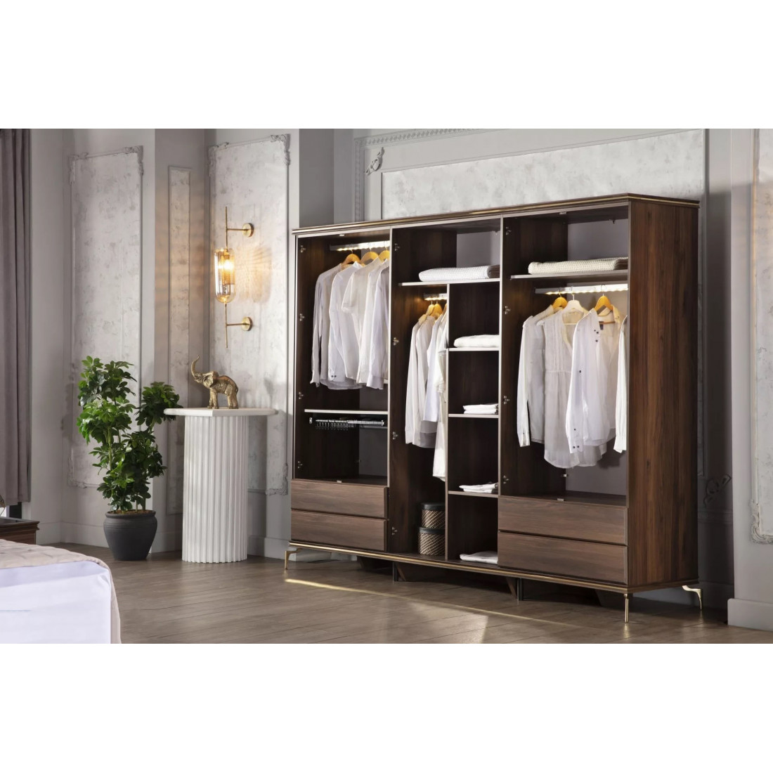 Шестидверный шкаф для одежды с зеркалом "Montego" – это великолепное и выгодное предложение для большой просторной спальни или гардеробной. Взять один большой шкаф намного удобнее, чем набирать много маленьких и думать, хорошо ли они сочетаются между собой. Изделие выполнено в современном дизайне.