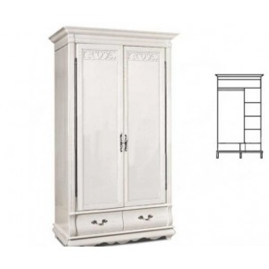 Массивный двухдверный шкаф для спальни из коллекции "Оскар" органично впишется в интерьер в классическом стиле. Высокие карнизы и романтичный резной узор придают модели изящества. Выдвижные бельевые ящики на направляющих. Фасад выполнен из массива дуба, модель окрашена в оттенок "Белая эмаль с патиной".