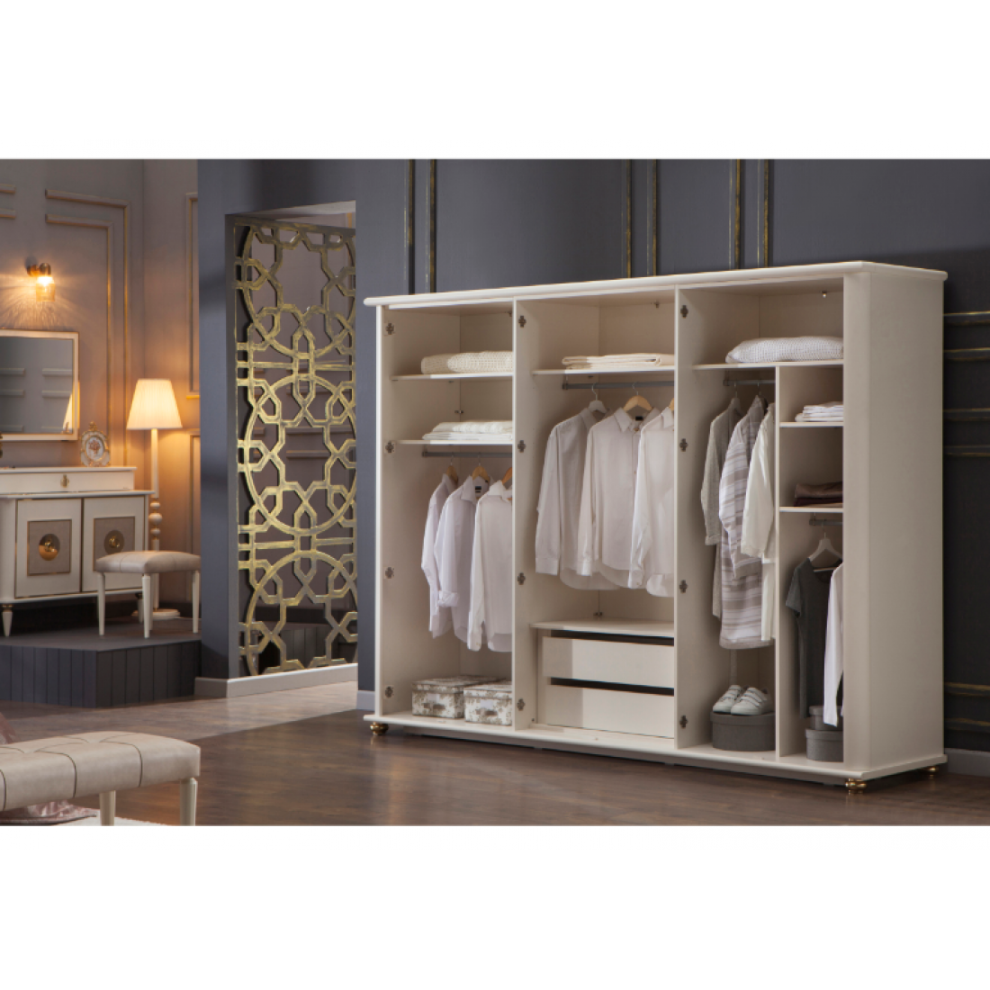 Шести-дверный платяной шкаф Mistral от Bellona. Три зеркальные двери по краям, и три двери с золотой отделкой, металлическими ручками в виде петли в центре. Шкаф вместительный, по высоте подходит для большинства помещений, глубина 68 см - позволит удобно разместить вешалки с одеждой. Двери с доводчиками, обеспечивающими плавный ход и безопасность. Шкаф изготовлен из высококачественного ЛДСП производства Турция, класс эмиссии формальдегидов Е1.