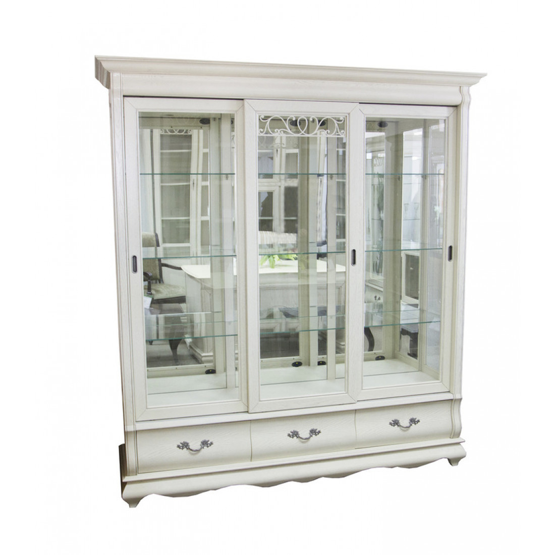 Классический трехдверный шкаф со стеклянными витринами из коллекции мебели "Оскар" это гармония изогнутых форм и стекла. Стеклянные дверцы с фацетом декорированы ажурной резьбой с растительным орнаментом. Фасад выполнен из массива дуба. Модель окрашена в оттенок "Белая эмаль с патиной"