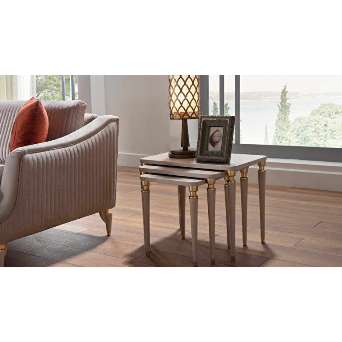 Стол журнальный Санвито SANV-52 это оригинальное дизайнерское решение от турецкого бренда Bellona. Три журнальных столика собираются в одну небольшую композицию. Экономия пространства с одной стороны, и возможность размещения нескольки столиков в разных частях дома,с другой. Столики имеют разные габаритные размеры :1) 620х400х490 мм 2) 490х400х460 мм 3) 370х400х430 мм. Выполнены в традиционных кремовых тонах с использованием золотистой оттделки. Эффектные, компактные , просто шедевр мебельного искусства.