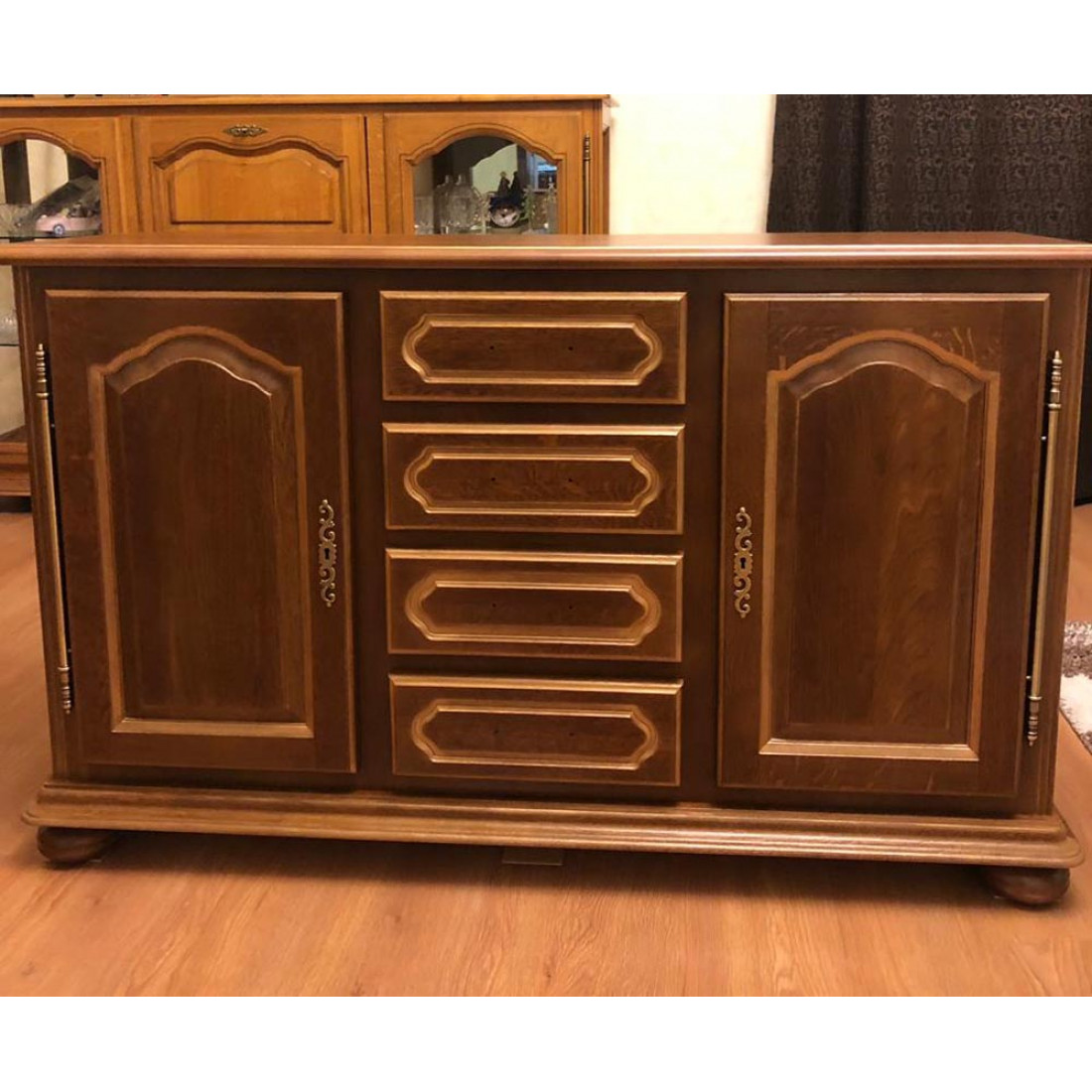 Классическая тумба с выдвижными ящиками и дверцами для гостиной из коллекции мебели "Давиль". Выполнена из массива древесины дуба, декорирована фрезерованием. Выполнена в цвете "Медовый дуб с золотой патиной".